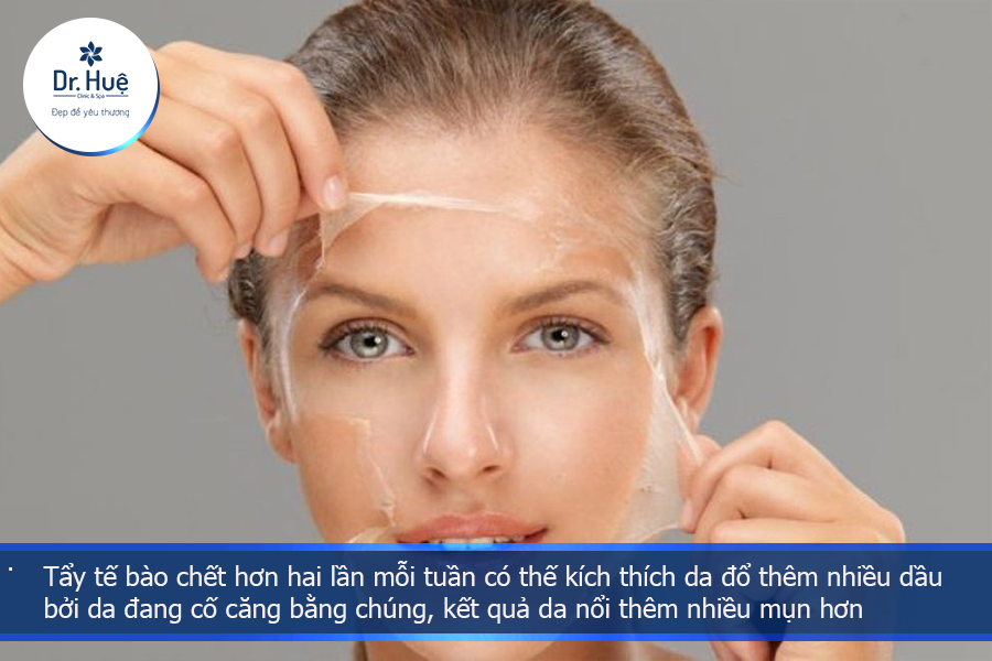 Tẩy tế bào chết hơn hai lần mỗi tuần có thế kích thích da đổ thêm nhiều dầu bởi da đang cố căng bằng chúng, kết quả da nổi thêm nhiều mụn hơn.