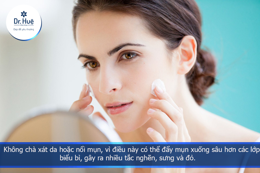 - Không chà xát da hoặc nổi mụn, vì điều này có thể đẩy mụn xuống sâu hơn các lớp biểu bì, gây ra nhiều tắc nghẽn, sưng và đỏ.