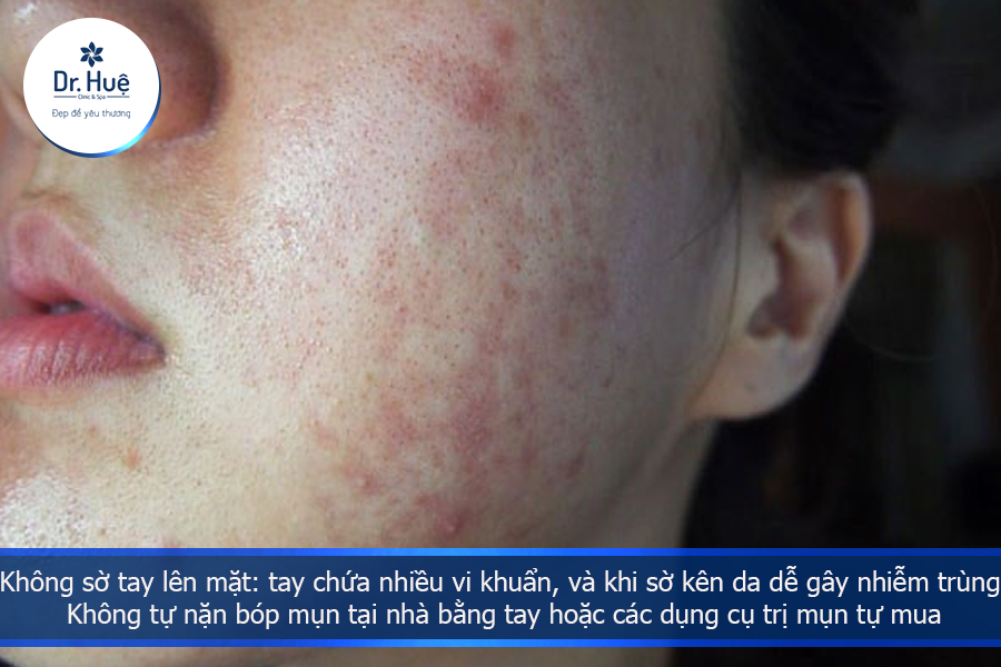 - Không sờ tay lên mặt: đây là một quy luật bất thành văn mà bạn cần lưu ý trong suốt quá trình điều trị. Tay chứa nhiều vi khuẩn, và khi sờ kên da dễ gây nhiễm trùng. Không tự nặn bóp mụn tại nhà bằng tay hoặc các dụng cụ trị mụn tự mua.